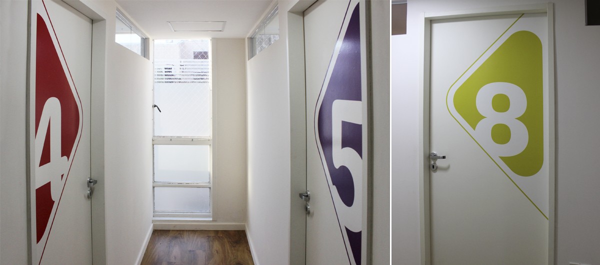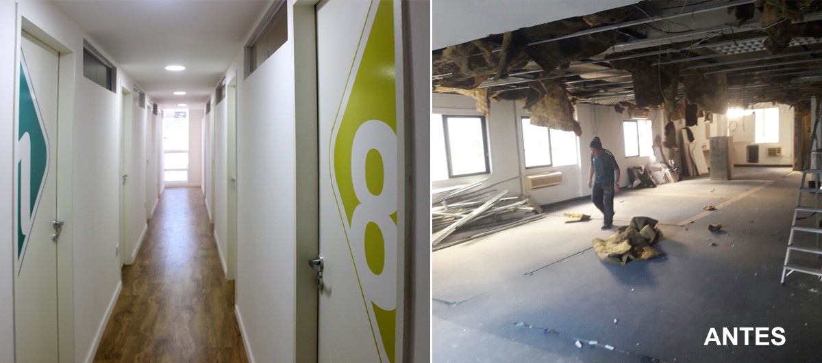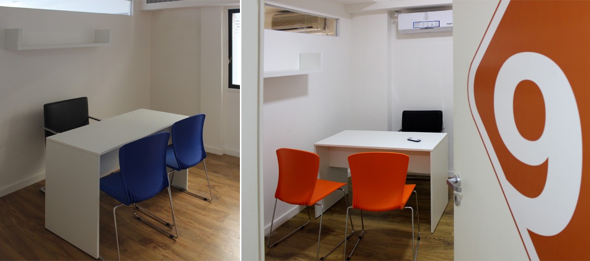 Climatización general, producción de mobiliario para cada uno, y colocación de gráficas, identificando cada consultorio en diferentes colores. Proyecto llave en mano.