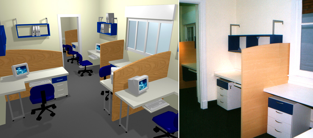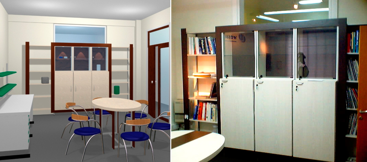 Oficina / Depósito Wasserberg: Remodelación oficinas y depósito en la calle Zabala al 3500 en Capital, sup aprox. 300m2, implicó Layout general y obra húmeda en casa tipo chorizo existente, todas las instalaciones a nuevo, colocacion de nuevos pisos, diseño y producción de showroom, mobiliario e iluminación especifica.