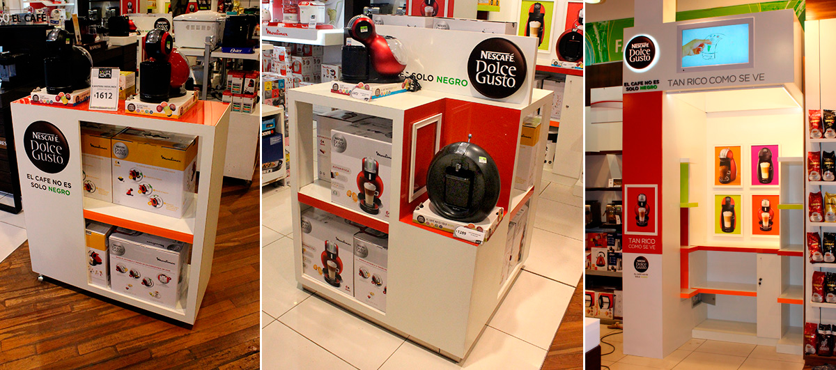 Dolce Gusto: Aplicación de imagen para lanzamiento Dolce Gusto, capsulas y maquinas Moulinex, diversos formatos, locales Home & Cook, corners en tiendas Falabella y góndolas para freeshop de Aeroparque.