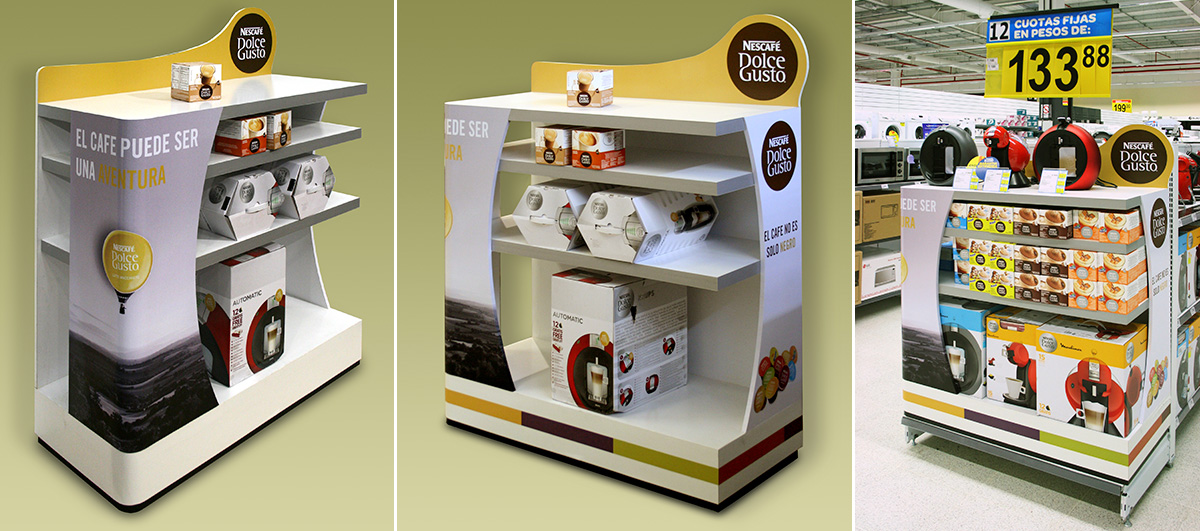 Dolce Gusto: Se realizaron líneas de exhibidores de diversos tamaños y funcionalidad para el lanzamiento de cafeteras Dolce Gusto.Los lugares de implementación fueron cadenas de retail electro, como Garbarino,Fravega , Rodo, etc.